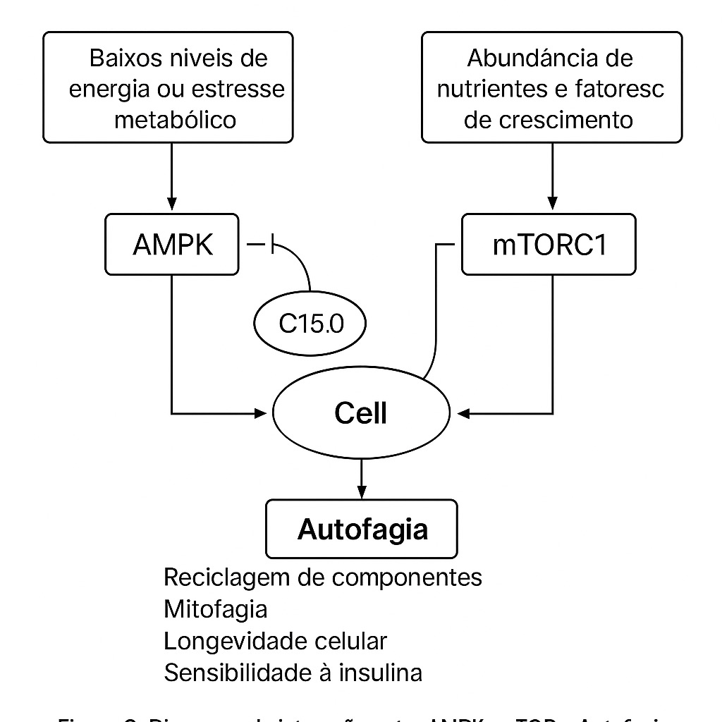 A composição lipídica das membranas celulares pode modular diretamente a atividade de proteínas sinalizadoras como mTOR e AMPK. A fluidez da membrana, determinada pela proporção de ácidos graxos saturados, monoinsaturados e poli-insaturados, afeta a formação de microdomínios lipídicos ("rafts") e a localização funcional de receptores e complexos sinalizadores. Lipídios oxidáveis, ao induzir estresse oxidativo e inflamação, podem favorecer a hiperatividade de vias pró-senescência e inflamatórias. Em contraste, lipídios estruturais mais estáveis, como os ácidos graxos saturados de cadeia ímpar, podem promover um estado pró-reparo e de homeostase. Estudos emergentes demonstram que o ácido pentadecanoico (C15:0) pode ativar a AMPK e inibir o mTOR em modelos celulares e animais, sugerindo um papel na otimização da sinalização energética celular e na promoção da autofagia [8,10].